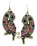PammyJ Earrings , Here is a spunky pair of burnished goldtone multi colored rhinestone owl dangle earrings. These pirched owls feature red, blue, purple, orange and green rhinestones! They measure 1" wide and 1 1/4" long and have a 2 1/8" drop. Your earrings will come to you in a foil gift box perfect for gift giving, or for you! Box may be a different color than shown. (Read More)